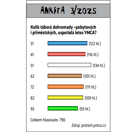 Protože otázka zahrnuje i příměstské tábory, tak správná odpověď ale zní, že YMCA letos uspořádala 82 táborů. Tuto možnost zvolilo 109 respondentů, tedy zhruba 14 % hlasujících. Většina účastníků tedy odhadovala nižší číslo, než je skutečnost. Nakonec 1 nebyl, takže finálně 81. Celkově lze říci, že veřejnost očekává spíše střední hodnoty (31–62 táborů) a skutečný počet táborů – 82 – je vyšší, než většina tipů naznačovala. To ukazuje, že YMCA pořádá rozsáhlejší program, než se mnozí respondenti domnívali.