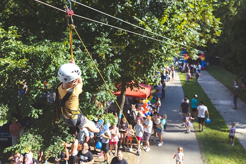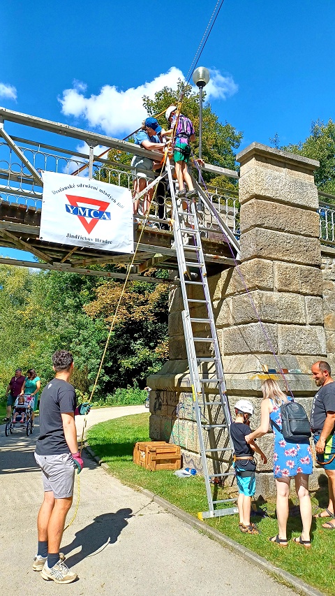 Jedním z nejoblíbenějších stanovišť bývá pravidelně to naše, jindřichohradecké YMCA. Není divu – nabízíme totiž lákavé aktivity: slaňování, lukostřelbu, jízdu na kanoi, letos nově i skákací hrad, a především jednu z nejdelších lanových skluzavek ve střední Evropě. To zní dobře, že? Má to ovšem jeden háček. Most přes řeku není zrovna alpský útes a lehká dětská těla kladky těžko rozjedou.