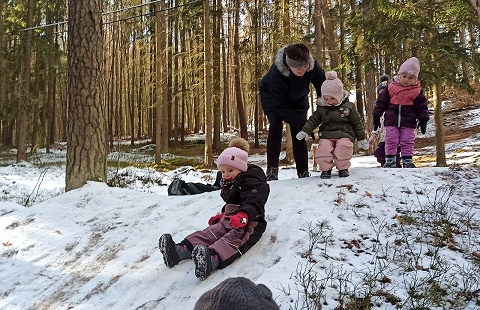 Tlapička není jen místem, ale živým prostorem, kde děti objevují svět prostřednictvím kontaktu s přírodou. Každodenní procházky do lesa jsou pro nejmenší skutečným dobrodružstvím. Hledání nejhezčího listu, poslouchání ptáků, překračování kořenů nebo objevování nových stezek – to vše rozvíjí jejich přirozenou zvídavost. Pro malé nožky je pohyb v přírodě neocenitelný. Zpočátku se rychle unaví, ale brzy se z nich stanou vytrvalí a jistí chodci. Les nabízí přirozený trénink rovnováhy, koordinace i celkové odolnosti – a navíc přináší radost z pohybu, kterou nelze ničím nahradit.