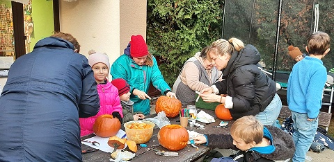 Od prvních minut se naše zahrada naplnila radostným ruchem – přišly malé děti, školáci i dospělí, celé rodiny. Každý si našel to své, ale hlavním bodem programu bylo samozřejmě vydlabávání dýní a výroba slavných Jackových luceren.